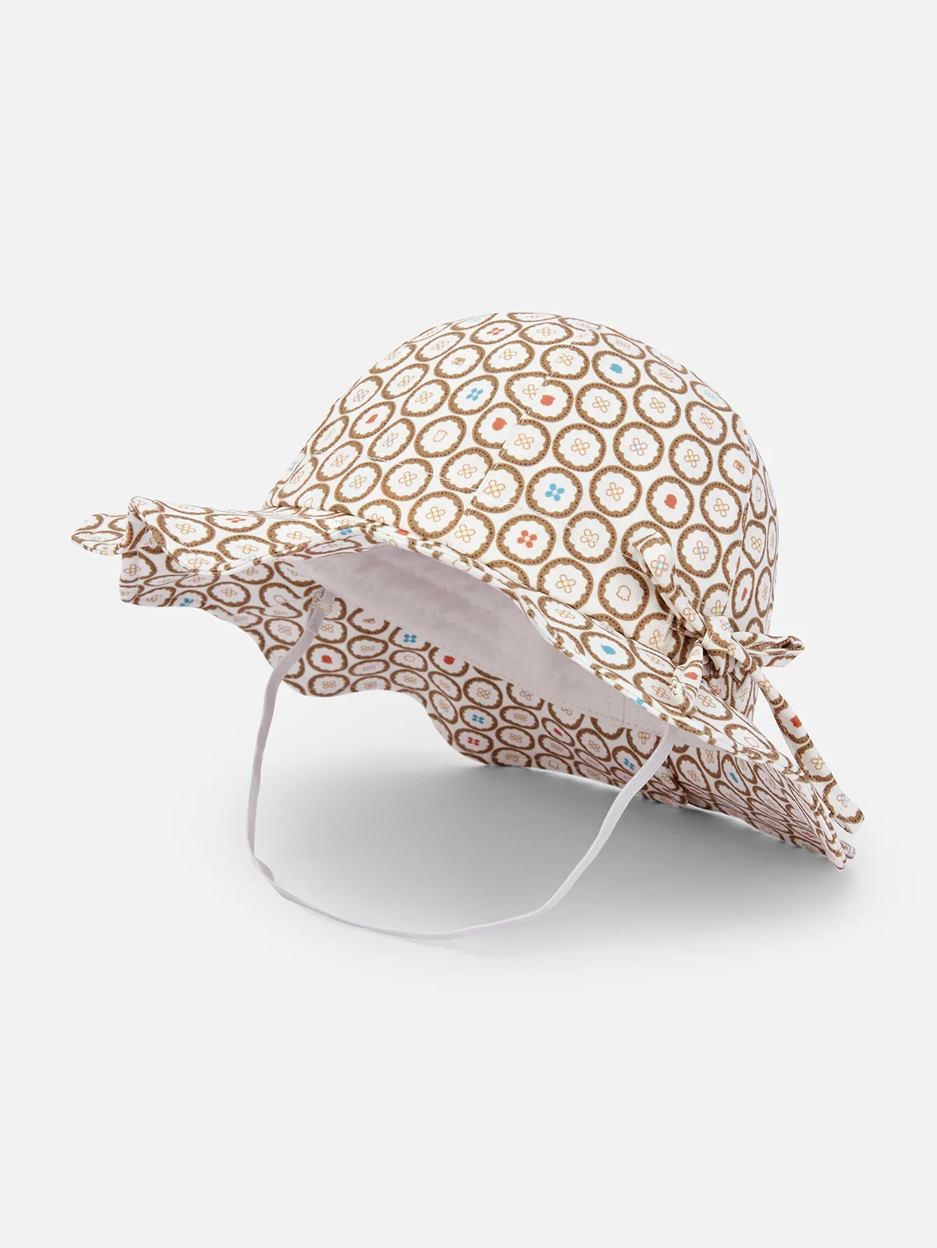 Hat type: Dome basin hat Selling points: Colorful circle printed pattern, cotton lining, comfortable and breathable; petal-shaped brim, sweet and cute; bow drawstring on the side of the hat, adjustable head circumference; intimate detachable windproof rope, no fear of strong wind, details add points.