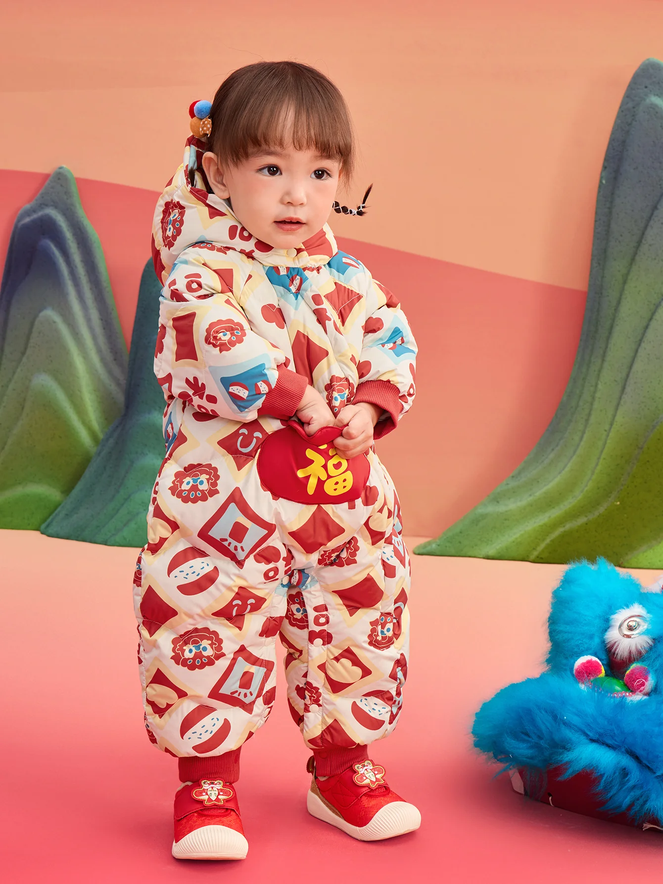 Dora&Doris joint IP: Little Nian beast who loves to eat fireworks. 85 down core new down-each down has been washed and cleaned for more than 30 times to meet the high process standard of "no falling to the ground", with RDS certification tag cleanliness - 700+ or more fluffiness - 650+ or more. The big shape pocket on the chest and the gold ingot on the head symbolize the new year, full of wealth!