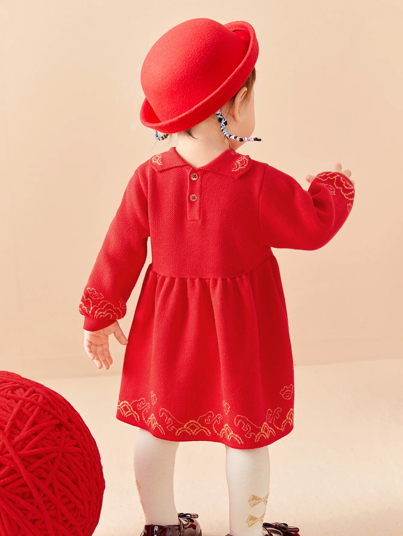1. The whole piece has a fine jacquard paper kite pattern, with gold and red colors, adding to the lively and festive atmosphere of the New Year. 2. Use 100% pure cotton yarn, which has the advantages of softness and skin-friendly, good breathability, strong hygroscopicity, good durability and environmental protection and health. Provide good protection for your baby's comfort and health. 3. The exquisite paper kite 3D small seal is combined with the innovative plate buckle, which is a cute and interesting national style detail. 4. The skirt is made of double layers of gauze, and the bronzing dot mesh adds a gorgeous feel. 5. Sweet little lapels add girly details.