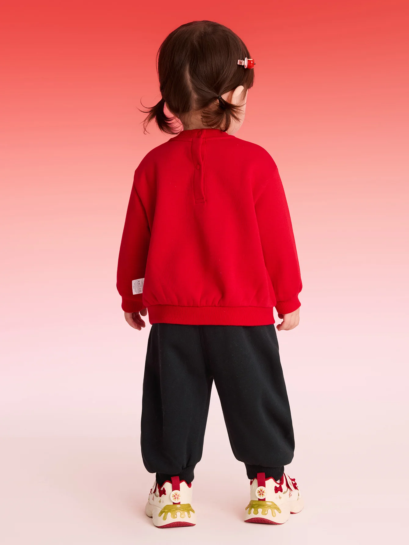 1. A versatile and wearable sweatshirt set featuring a festive red sweatshirt and black sweatpants, perfect for both boys and girls, perfect for indoor wear or layering with a down jacket. 2. Creative pattern design, coinciding with the Year of the Horse in 2026, features a cute pony print and all-over print. The floral pattern features elements like horses, potato chip bags, lollipops, and gourds, creating a stylish and simple look. 3. The fabric is lined with fleece for added warmth in winter.