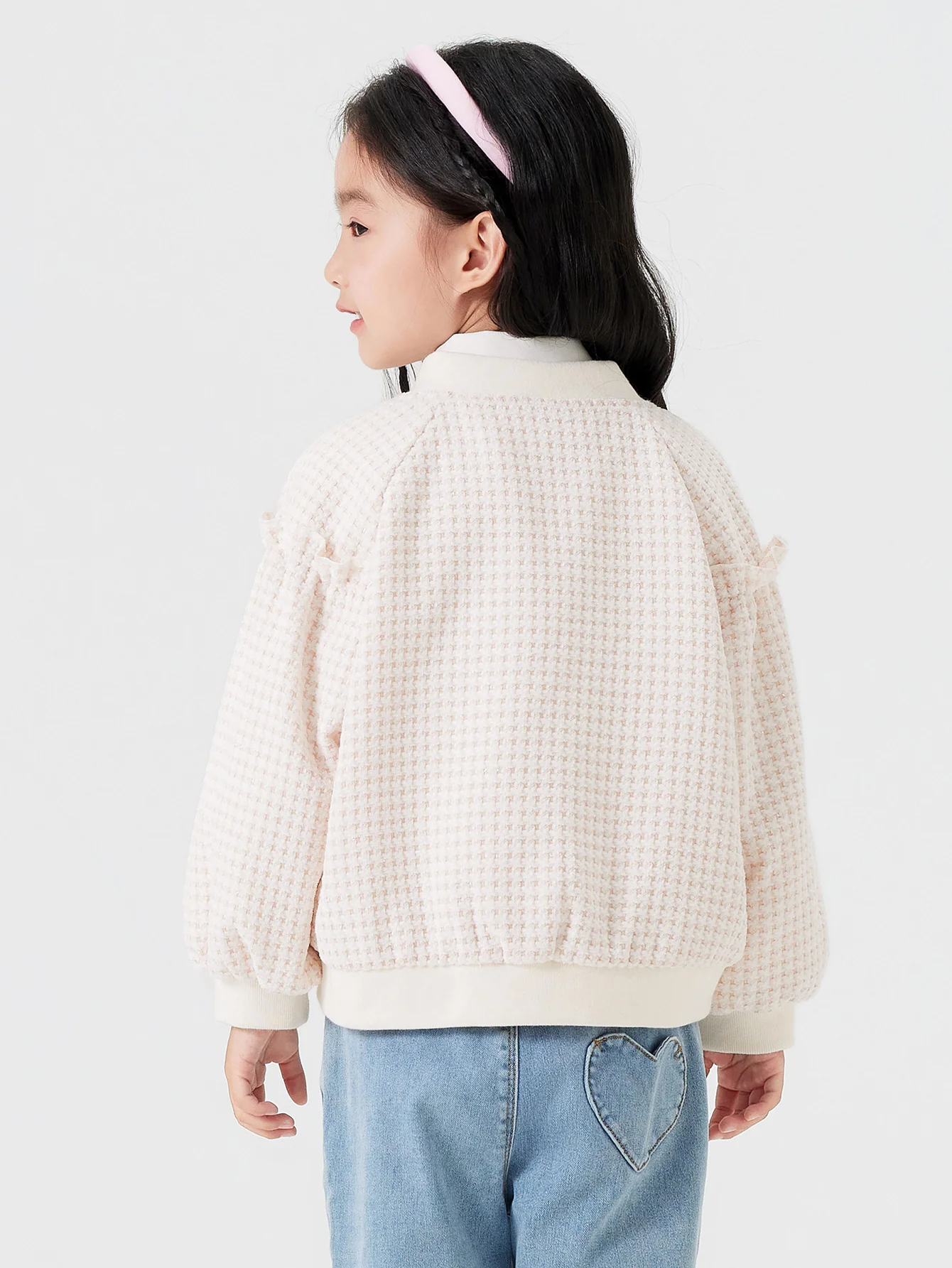 1. Color: This is champagne color. 2. Style: This houndstooth fabric is exquisite and textured. It makes children look unique when wearing it. 3. Matching: This can be worn with T-shirts, jeans, and skirts at school, and it will look particularly suitable for daily wear. 4. Seasonal: This is suitable for wearing in autumn
