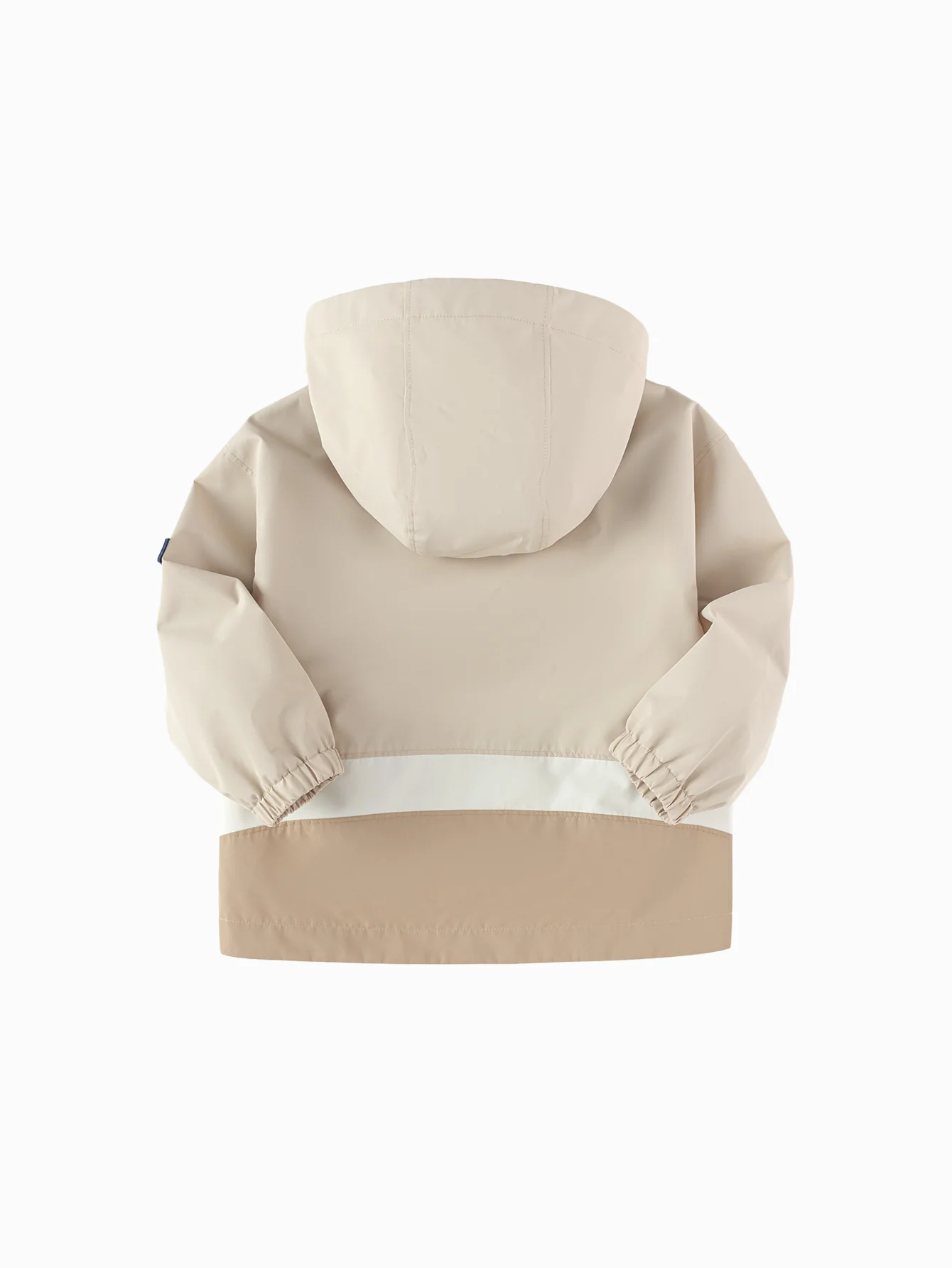 Matte peach skin fabric effect, film-coated waterproof and breathable fabric, recycleable environmentally friendly fabric, skin-friendly and comfortable 145G/TC knitted single-sided lining; college style letter floral pattern and versatile brown color matching; hooded style, raglan sleeves, short front and long back design, elastic hem; college style letter rubber patch on the left sleeve.