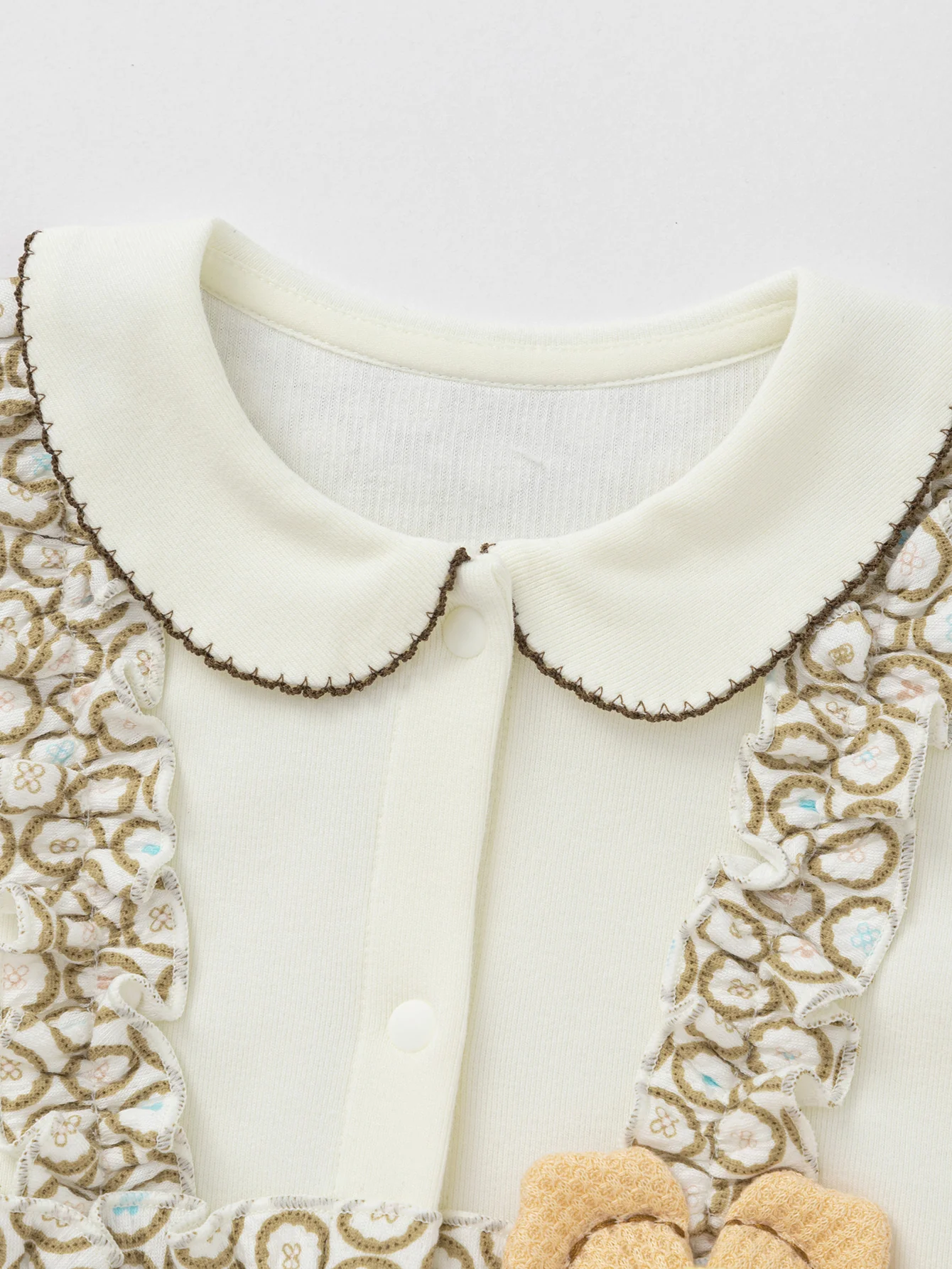1. Color: This white-brown color will make children look particularly cute and comfortable. 2. Style: This fake two-piece suspender style highlights the layers. The fabric has texture and elasticity. The cute three-dimensional flowers at the waist make children look particularly cute and lively. 3. Matching: This style can be matched with casual clothes for children to wear in daily life, and 4. Season: This thickness is suitable for wearing throughout the spring.