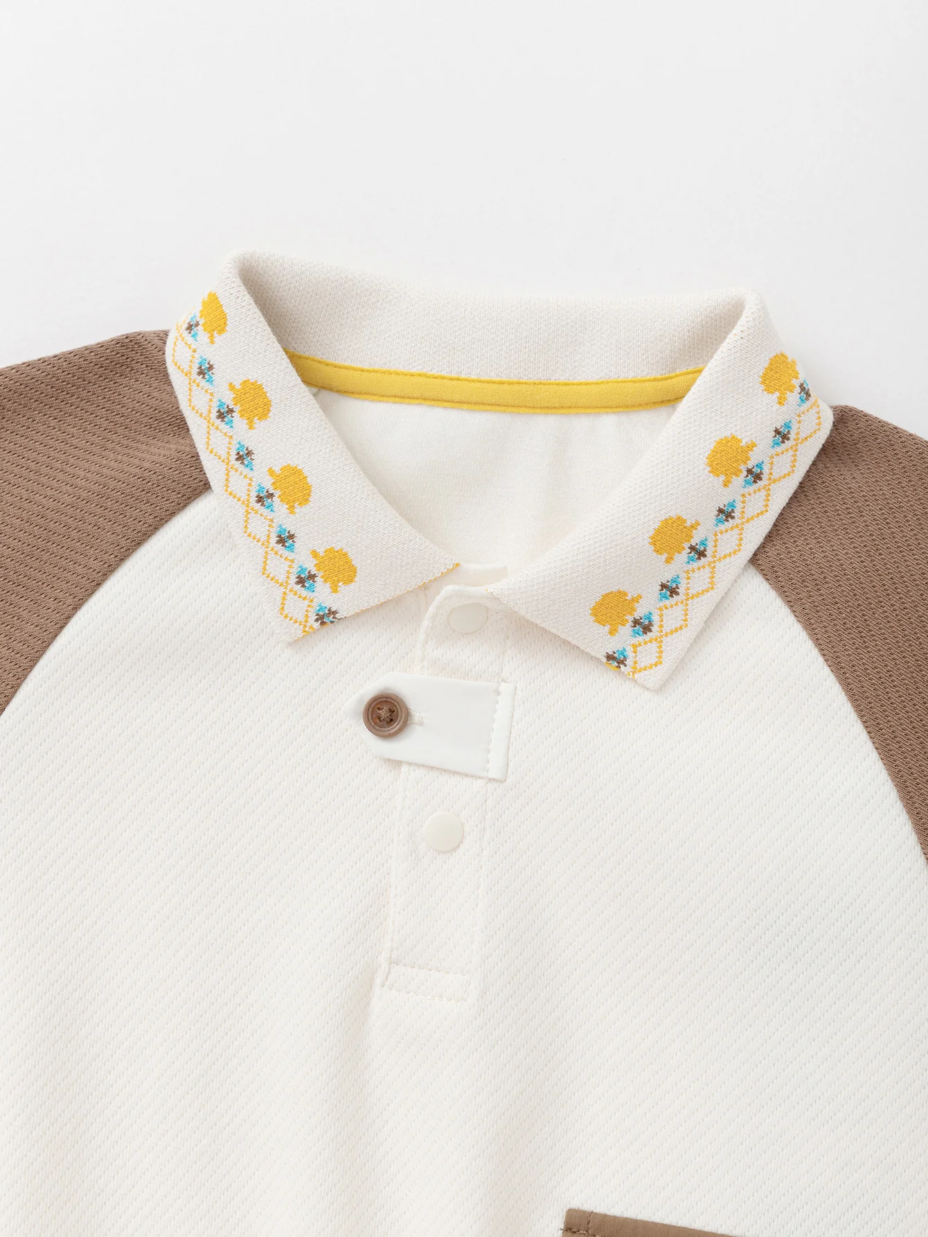 1. Color: This off-white color will make children look particularly fashionable and stylish. 2. Style: This contrasting raglan sleeve style, knitted fabric twill texture, flat collar with contrasting jacquard pattern, small octopus IP, soft feel. 3. Matching: This style can be matched with pants and casual clothes for children to go out exquisitely, and it is particularly suitable for daily wear. 4. Season: This thickness is suitable for wearing throughout the spring.