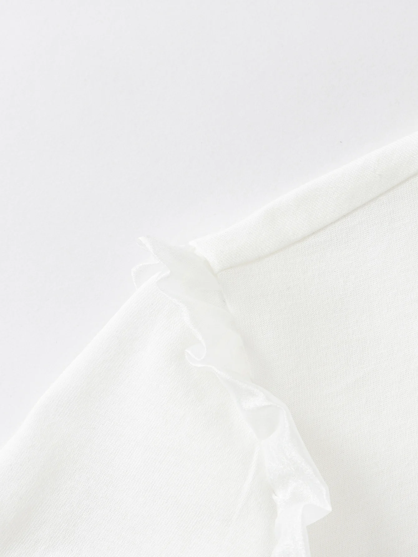 1. Color: This white and pink-green T-shirt looks particularly sweet and cute for children. 2. Style: This small, loose and sweet version is matched with cool fabrics, plus a three-dimensional floral print pattern and a different material fungus on the shoulders, making it cool, comfortable, delicate and sweet for children to wear. 3. Matching: This can be paired with trousers, shorts, and tutu skirts. It is very fashionable and sweet for children to wear when traveling. 4. Seasonal: This is suitable for wearing in summer.